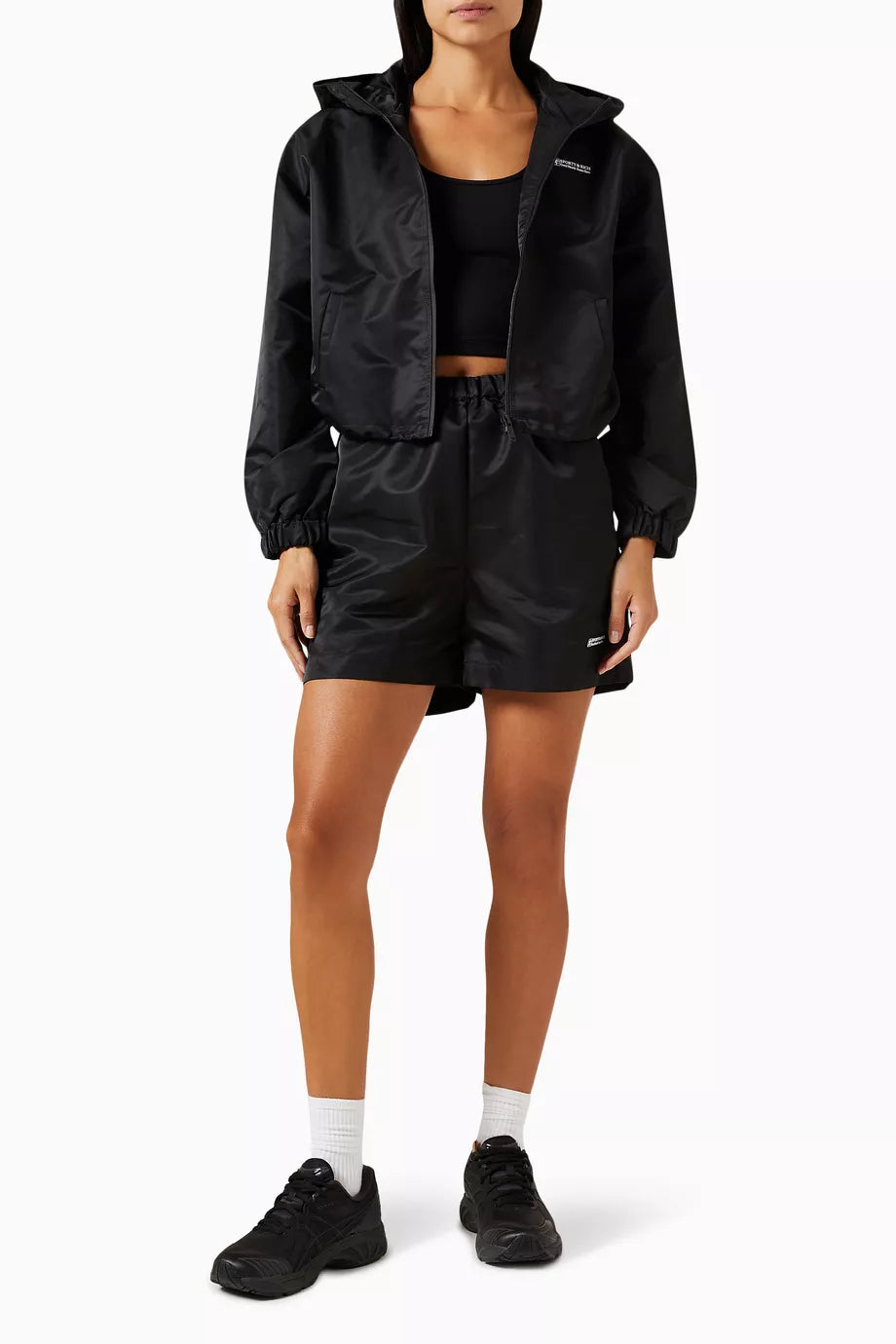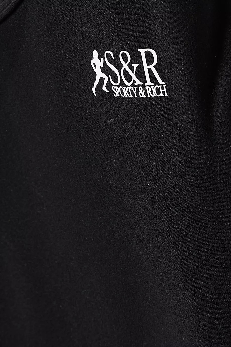 The Sporty & Rich SR Runner Sports Cropped Tank Top, crafted from stretch nylon, features a printed logo and racerback design. This tank top offers both style and functionality, making it perfect for workouts or casual wear.