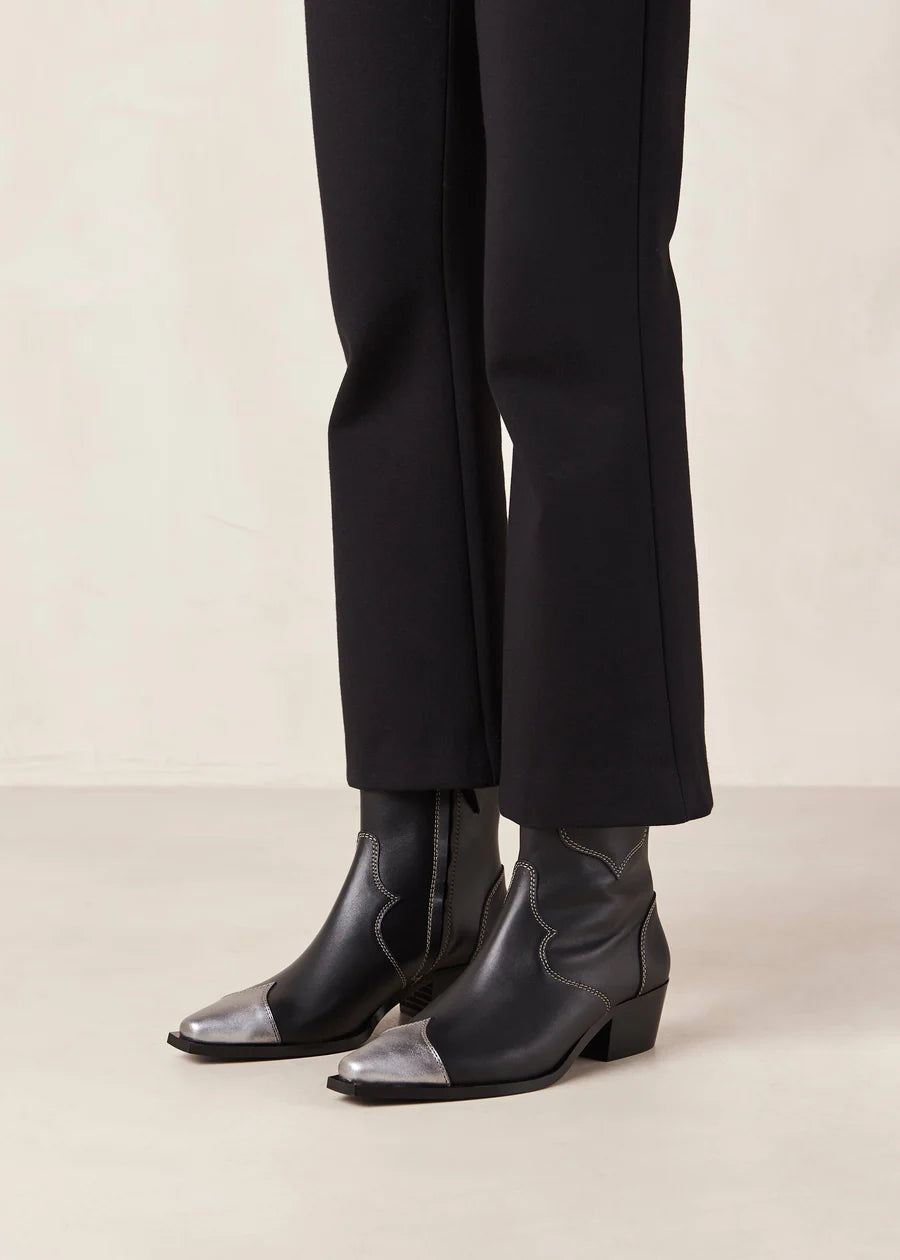 Its THE must-have pair for festival season and is now available in dark blue leather with contrasting white embroidery outlining the Western-inspired cutout and in total black with silver squared toe.