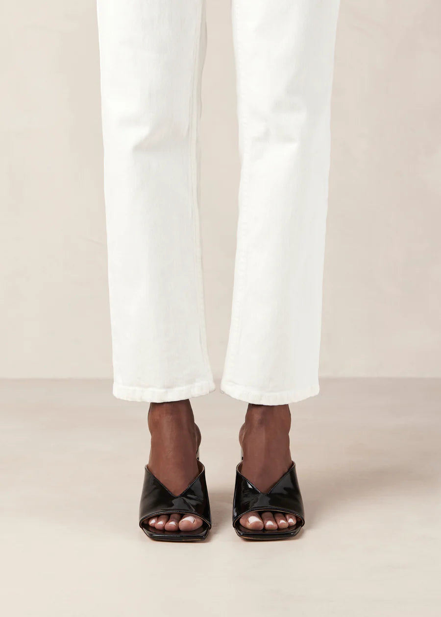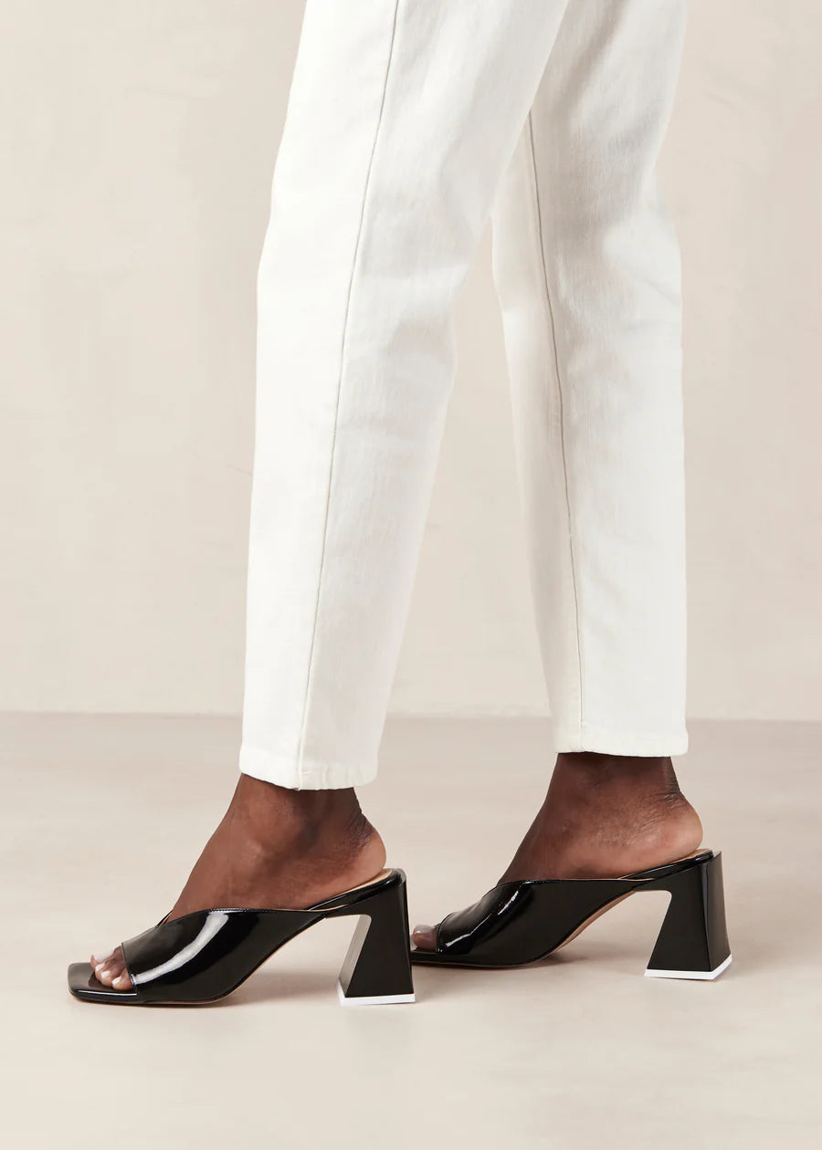 Monochrome moment. Tasha is a sculptural mule sandal crafted from black leather with retro v-cut straps and distinct square toes. Set on lacquered block heels, this shoe looks sophisticated yet fun. For a playful style choice you don’t expect, wear yours with colorful separates or a dress in zebra print.