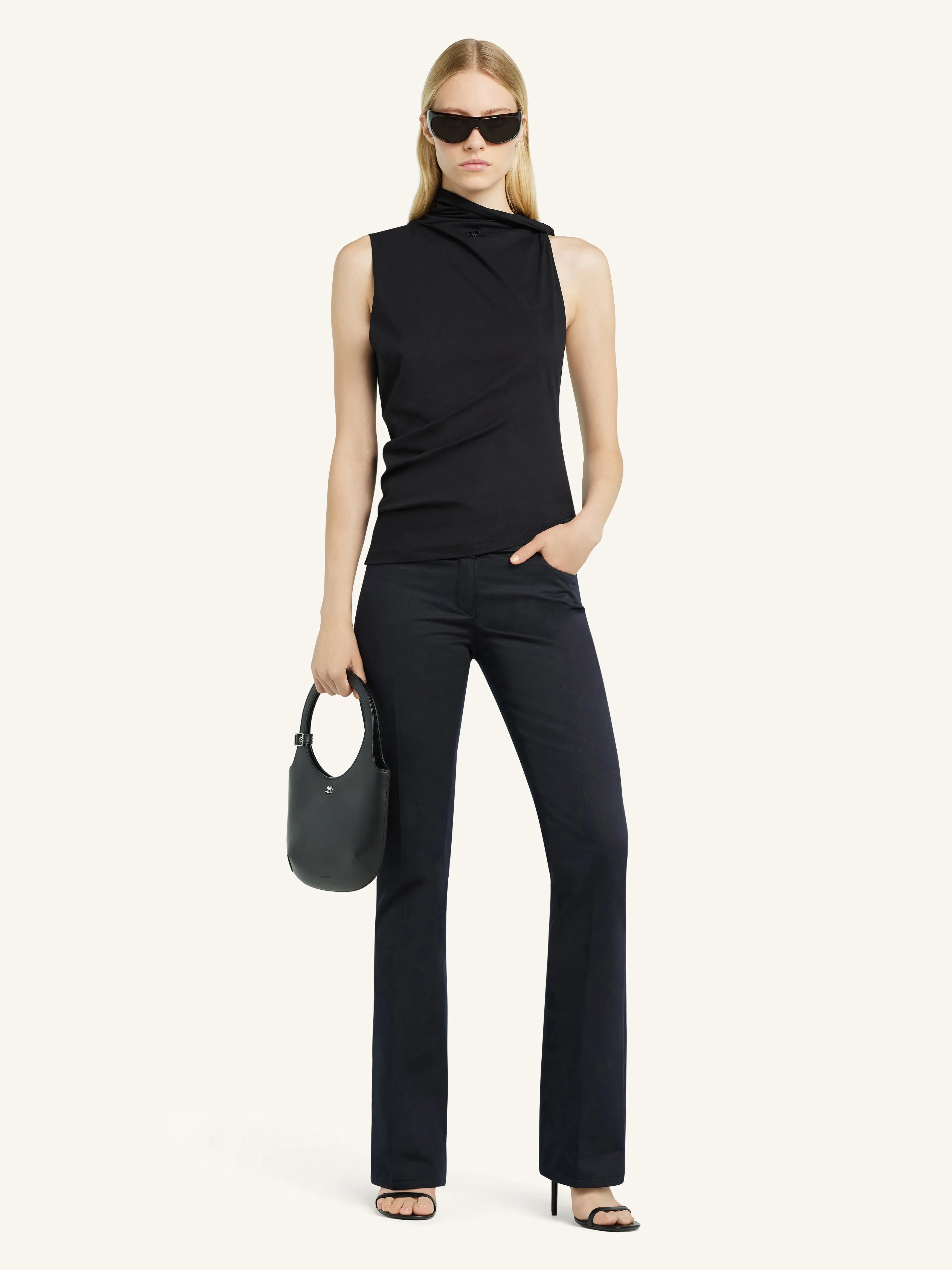 Sleeveless draped jersey top with AC logo centered at top of the chest.