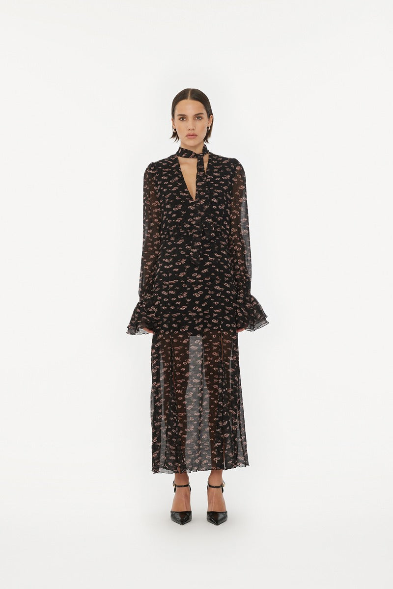 Indulge in effortless sophistication with our loose-fitted midi dress, boasting a mini-length lining for added comfort. With a high neck collar and transparent sleeves adorned with ruffles at the hem, it's the perfect blend of style and grace.