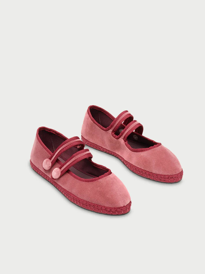 - Velvet mary jane in light red with red piping and double pressure button as closure.
