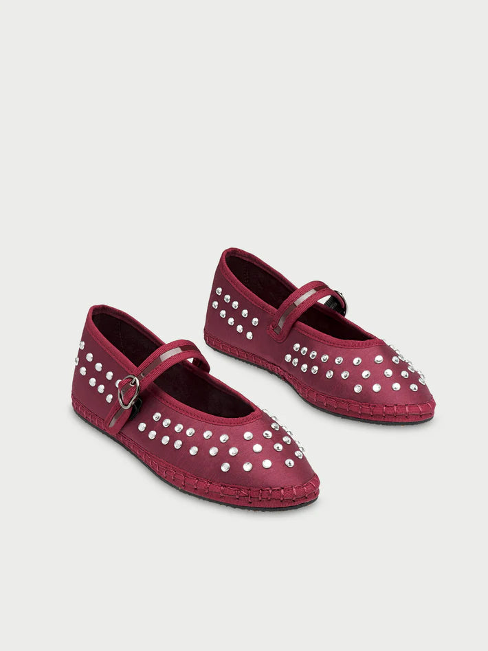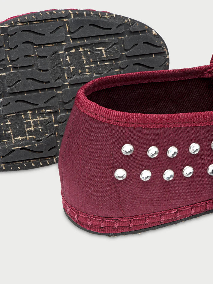 - Silk ballerina v-hole in burgundy with burgundy piping and crystal studs.