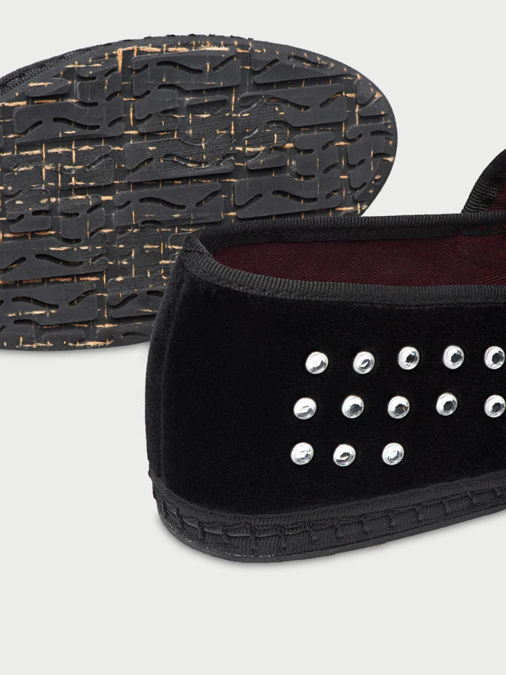 - Velvet ballerina v-hole in black with black piping and crystal studs.