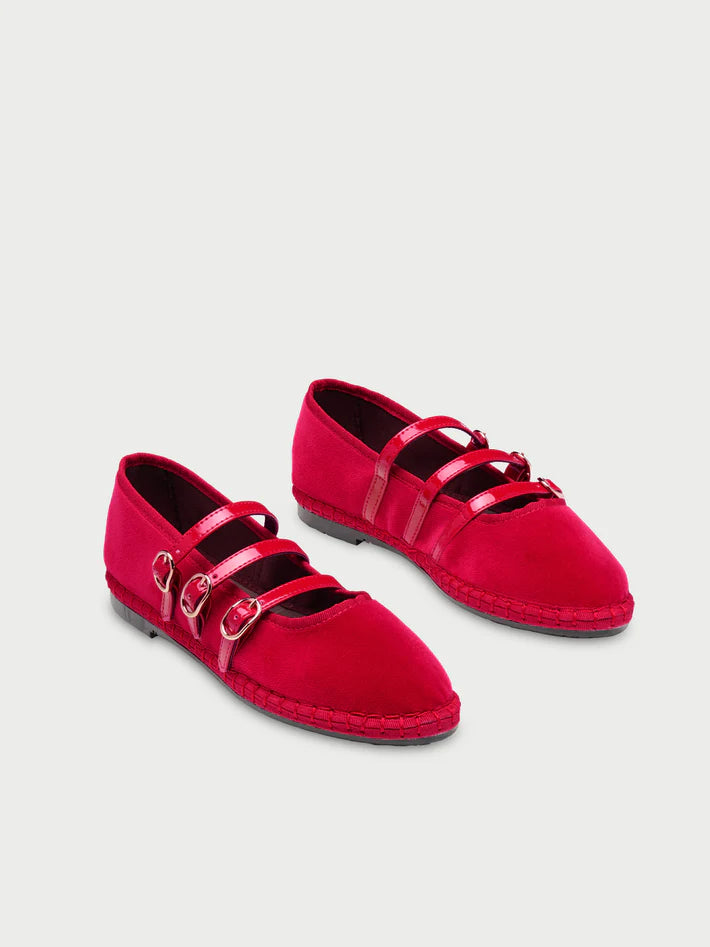 - Velvet triple strap mary jane in red with red piping and buckle closure.