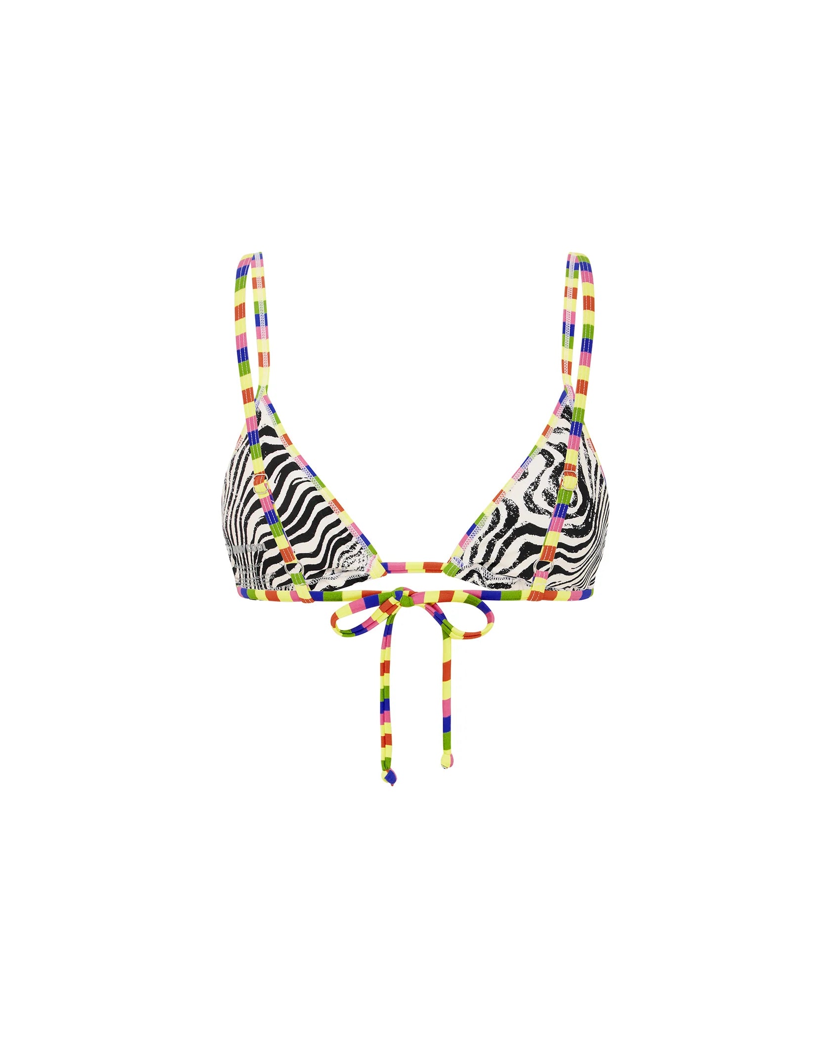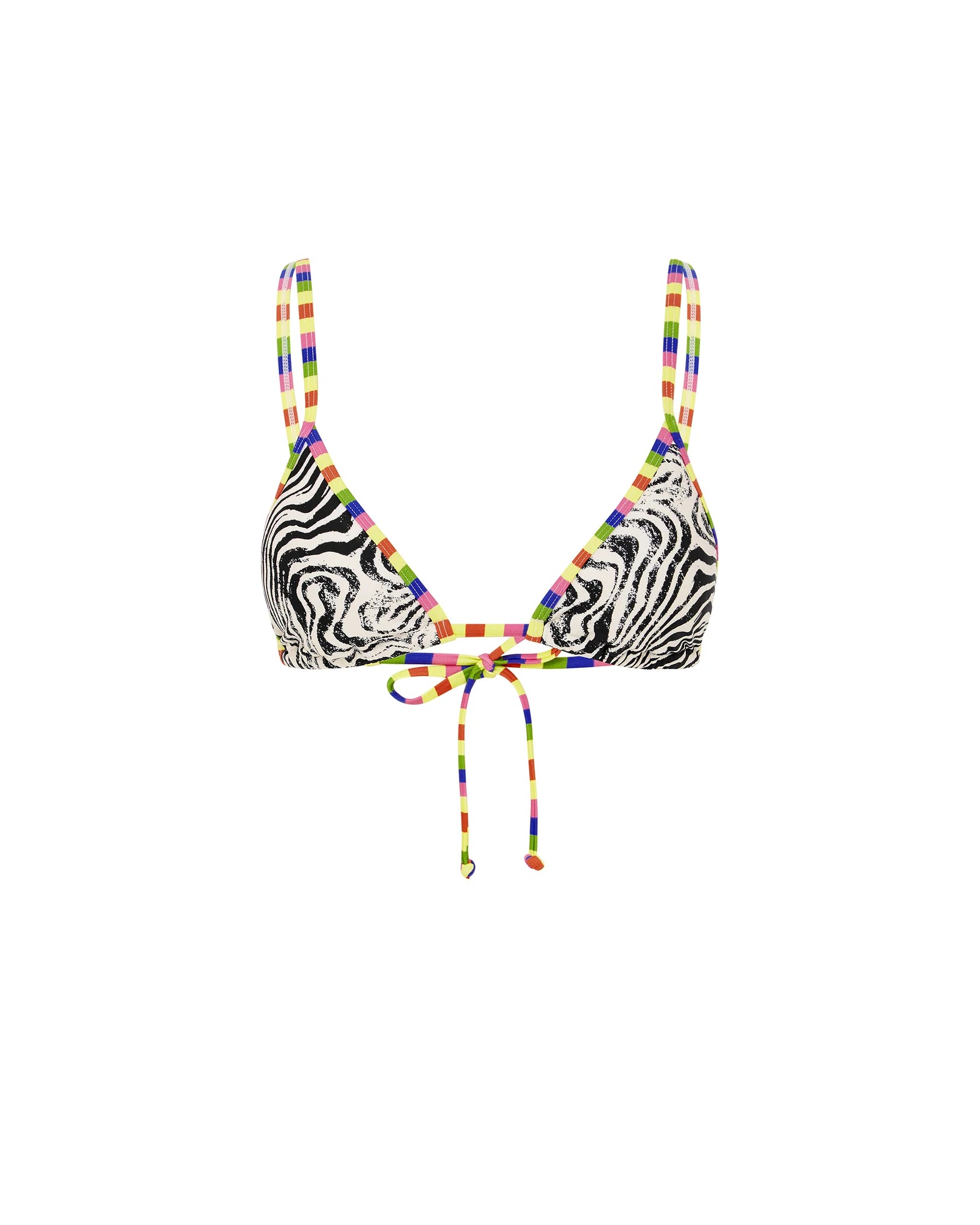 The Duo String Top in Mozart is crafted in our vibrant zebra-inspired print, accentuated with colourful contrast striped edging and ties, adding a playful touch.
