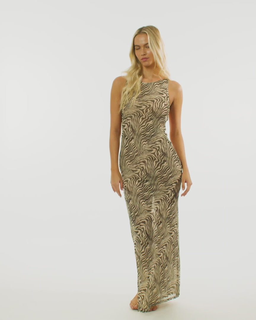 The Backless Maxi in Mozart effortlessly transitions between casual and dressy wear. Crafted from a super fine mesh material with ample stretch, this maxi dress guarantees a comfortable fit that moves with you. Its standout features include an open back and a side slit, in our zebra-inspired print.