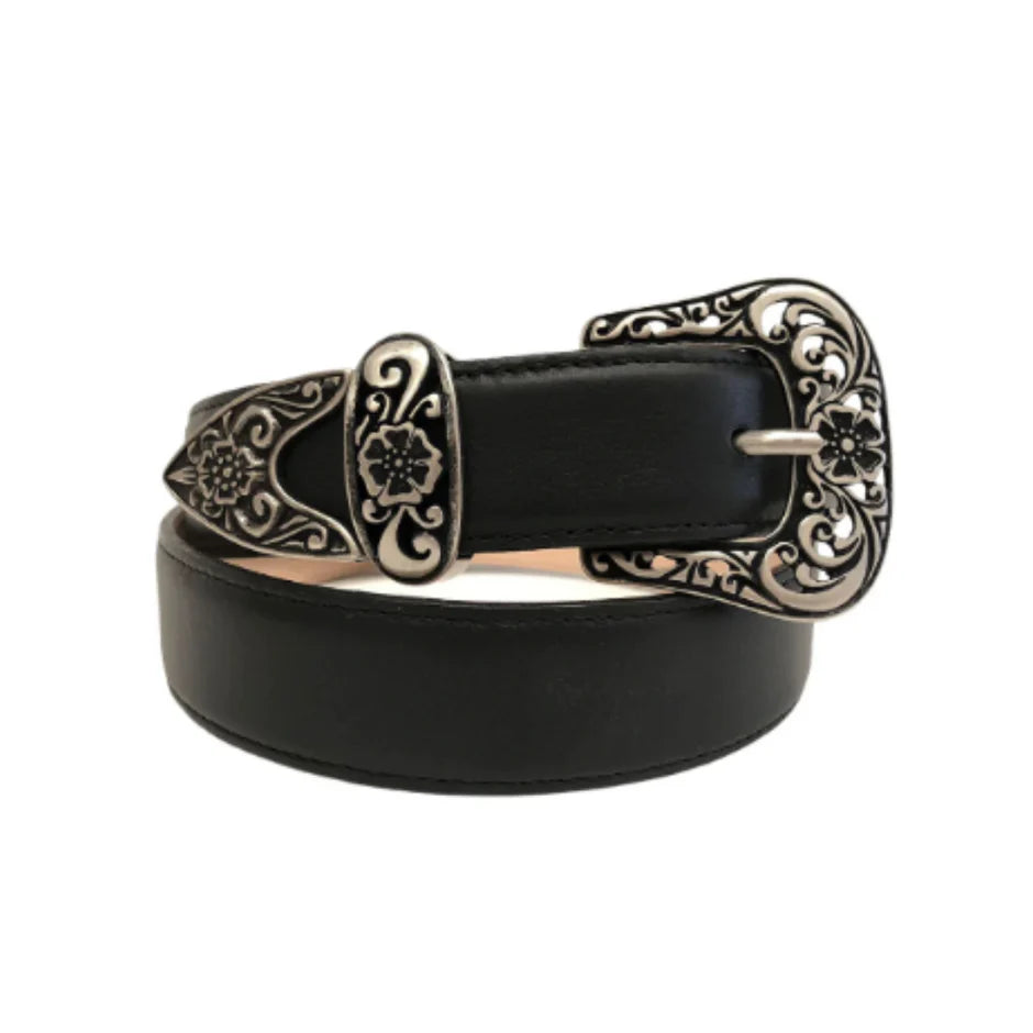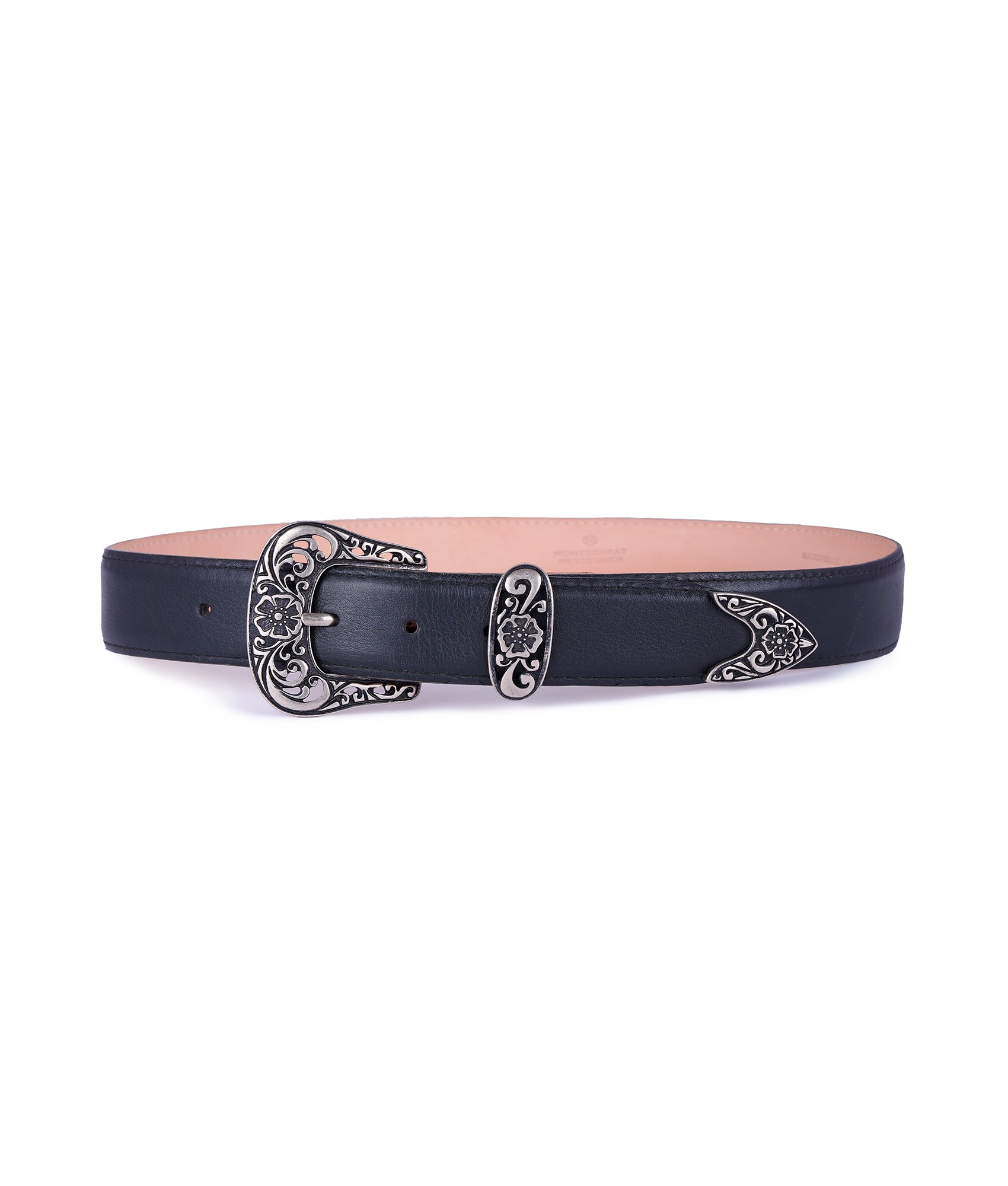 Cinturón 100% piel en color negro con hebilla vaquera intercambiable y puntera y troquel interno.