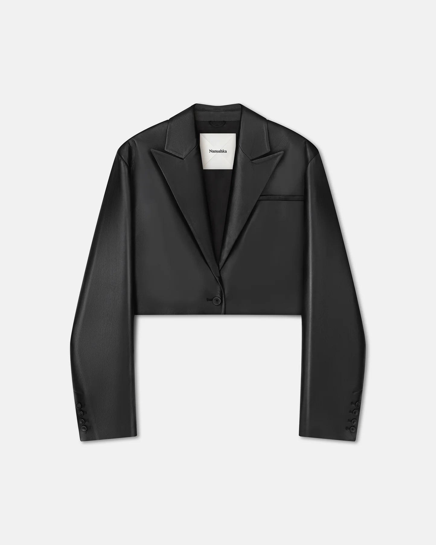 Boxy, masculine shapes that are rendered modern through cropping is a key design focus. Crafted from our signature OKOBOR™ alt-leather, the Aidula blazer has peak lapels, single-button fastening and cropped silhouette – make the most of the length with high-waisted pants.