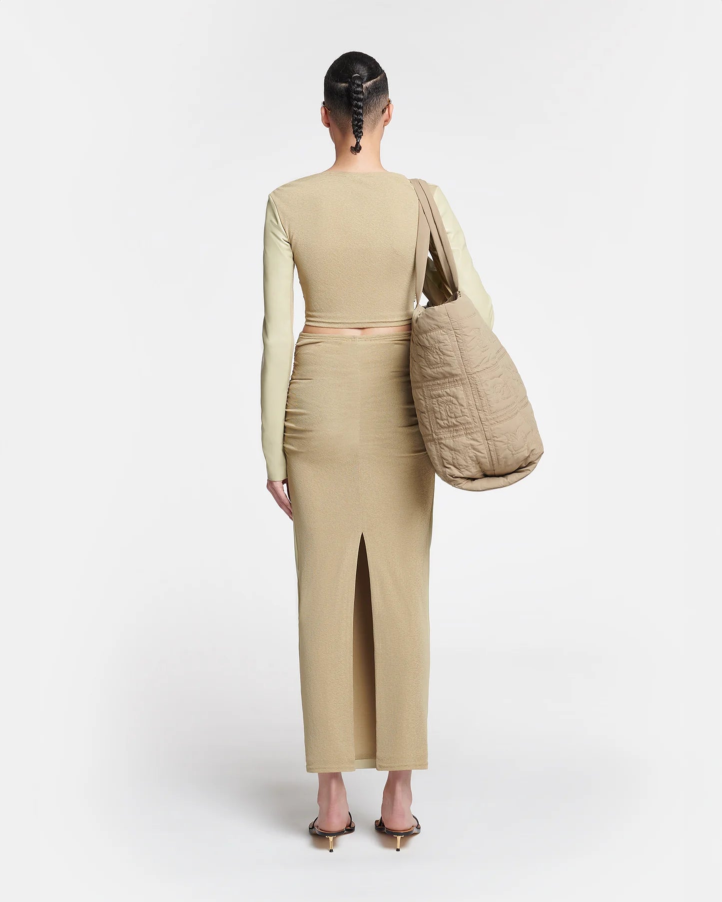We turn to cropped silhouettes for their modern ease. The Maylah top is made from our innovative Okobor™ alt-leather with a scoop neckline, long sleeves and flattering ruched waist. The shape works perfectly with high-waisted separates.
