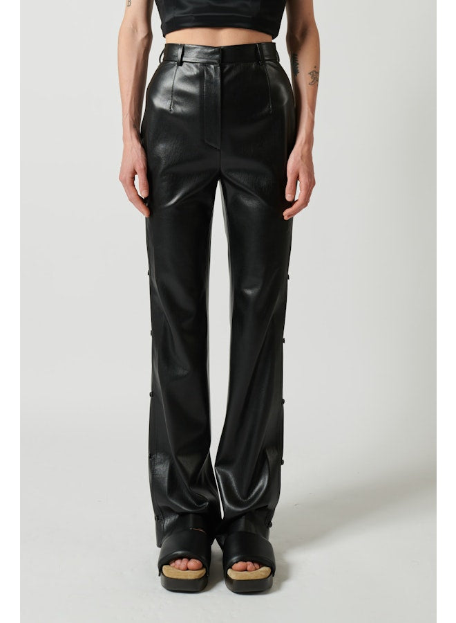 The Felina pants are distinguished by button and loop fastenings along the side, so they can also be worn as a split-hem style. They are crafted from our signature Okobor™ alt-leather and come in classic black – coordinating with other modular pieces in the collection.