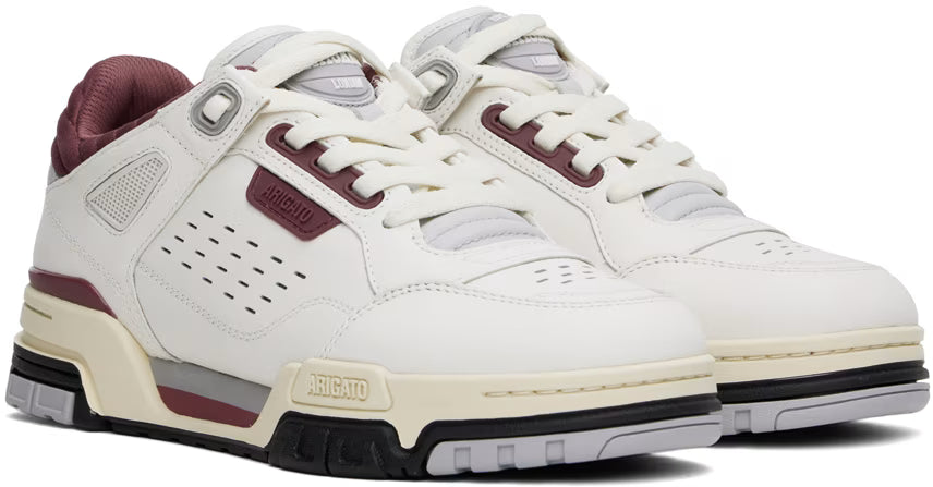 Handcrafted low-top buffed leather, suede, and recycled jersey sneakers in white and burgundy.
