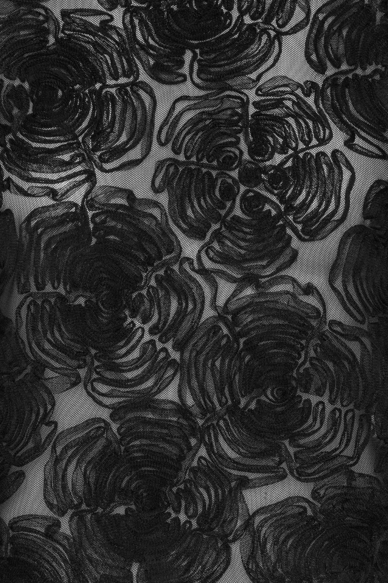 Flower Mesh Boatneck Top Black features a sheer mesh design with intricate floral embroidery. This sleeveless top has a high boatneck and a tie-back closure for an adjustable fit.