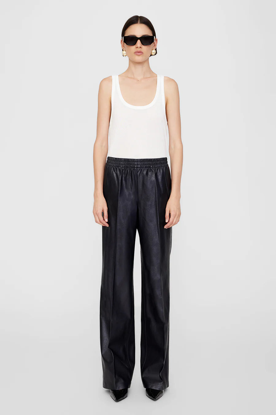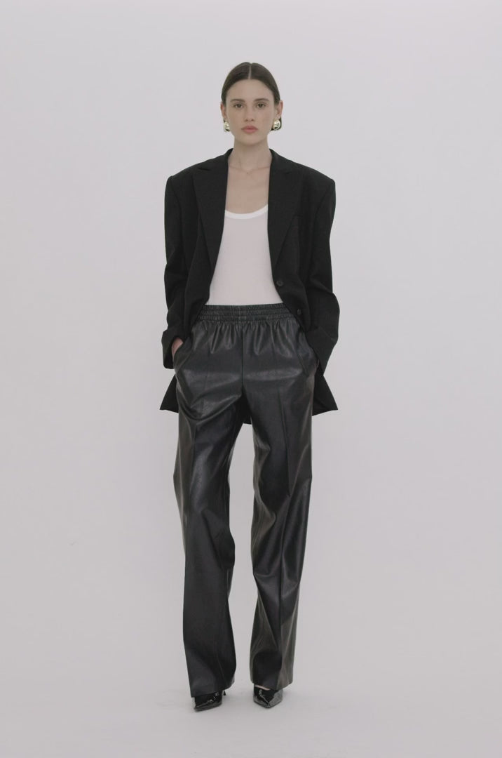 The Soto Pant is a relaxed, wide-leg style updated in midweight pebbled vegan leather with structure and a slight sheen. This unlined pair features an effortless, pull-on construction with inner cording at the waistband for an adjustable fit and two on-seam pockets.