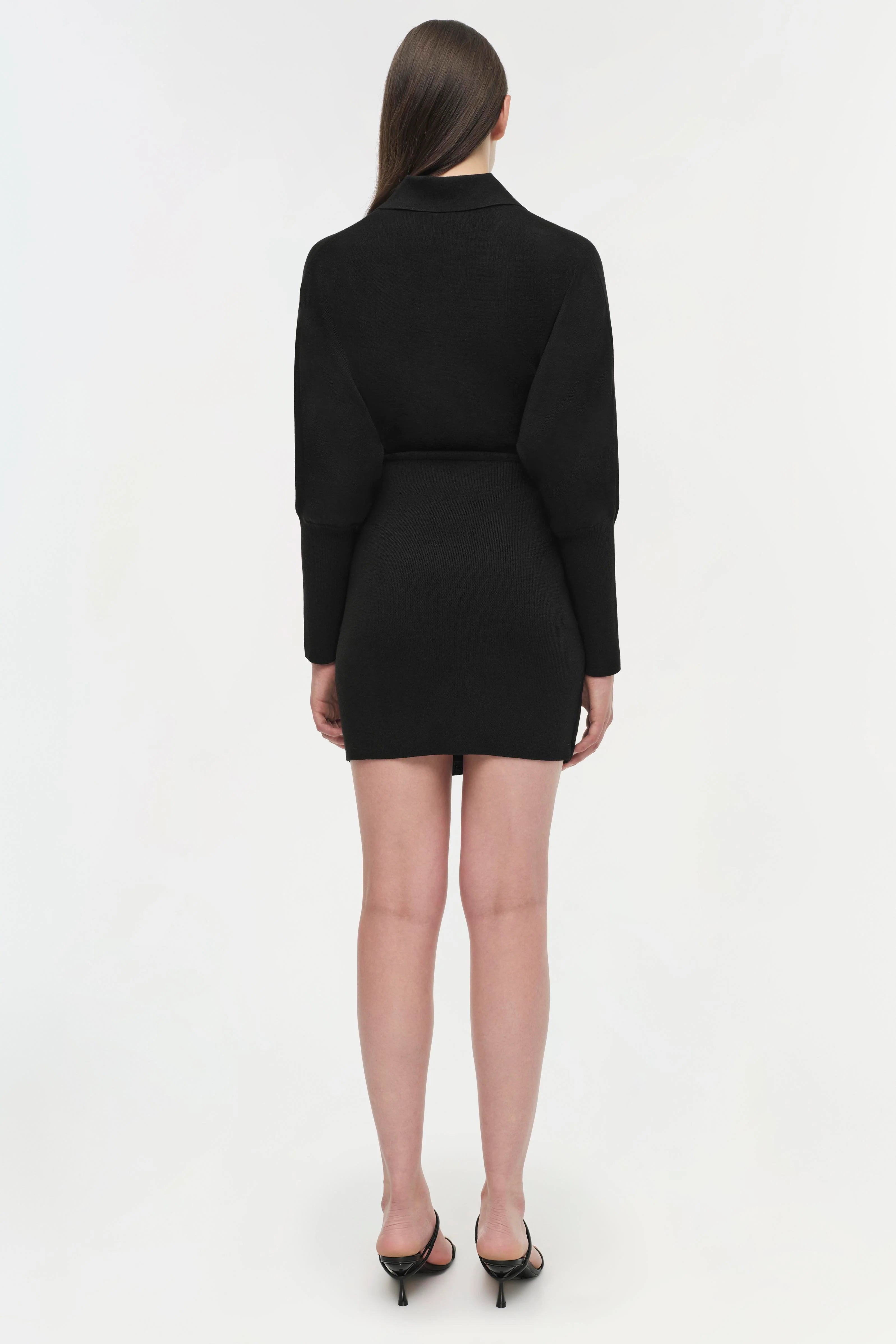 The Harvey Dress in Black. Features a half-zip neckline and sinched in waist, this long sleeve mini's wrapped skirt adds a unique touch to this versatile piece.