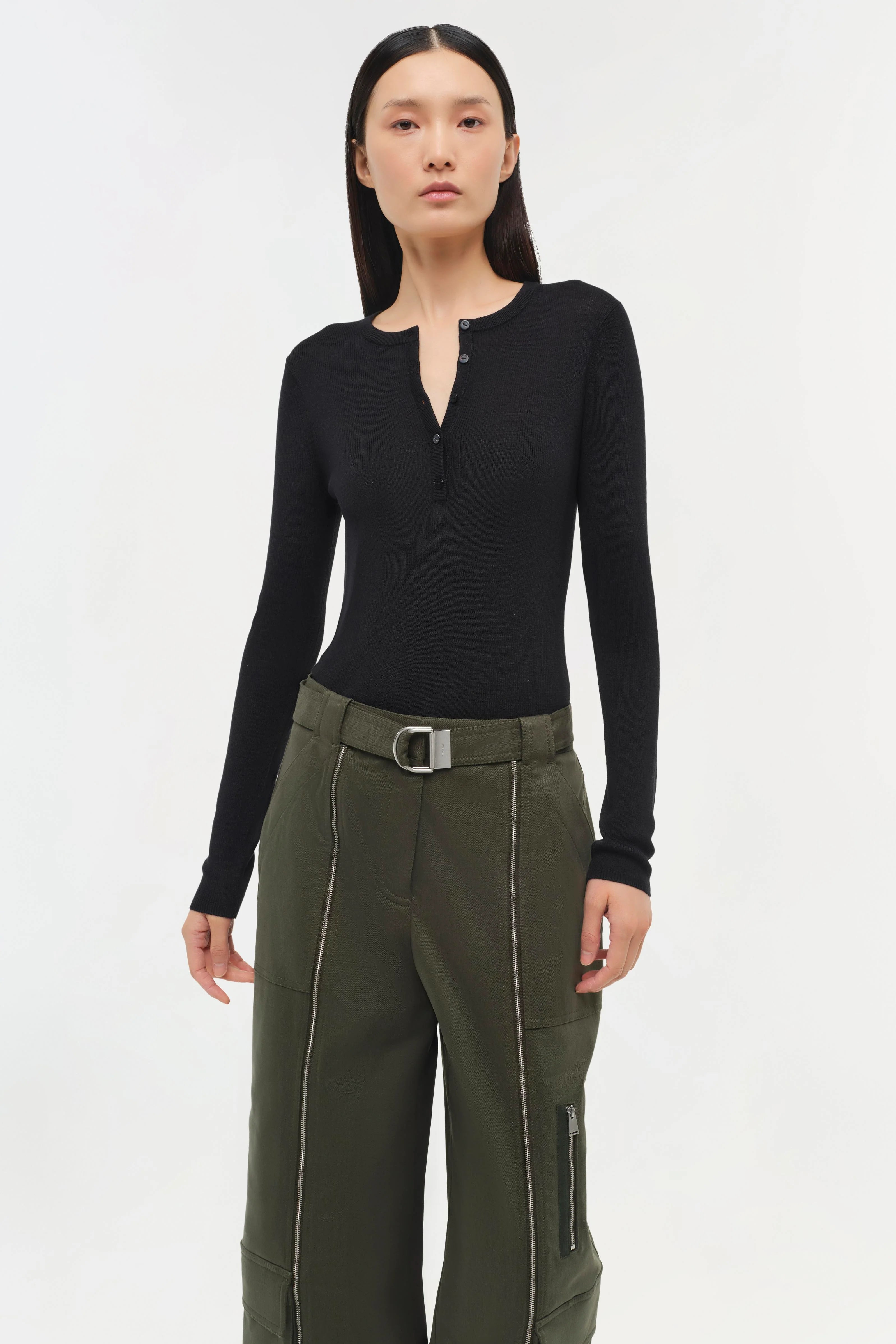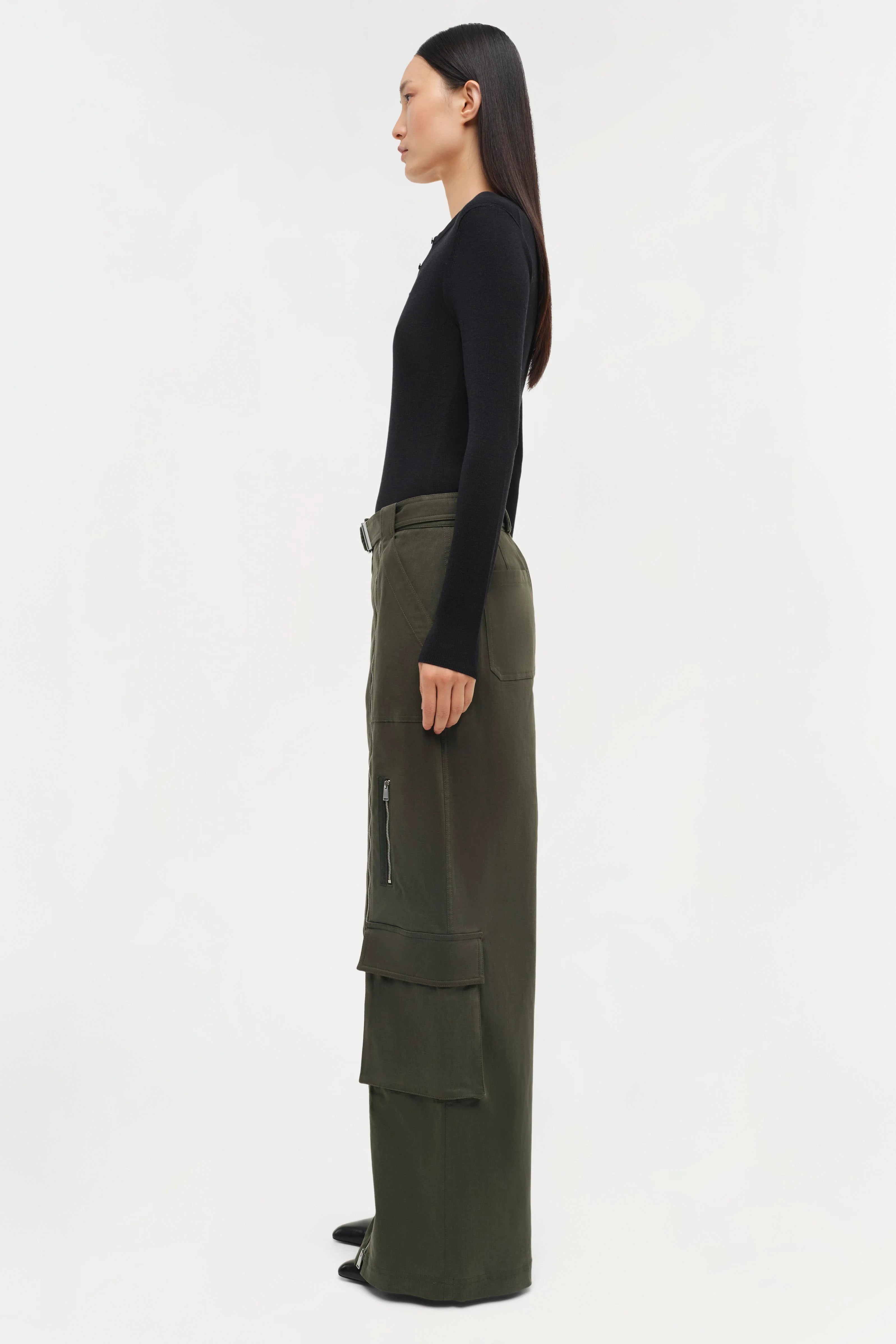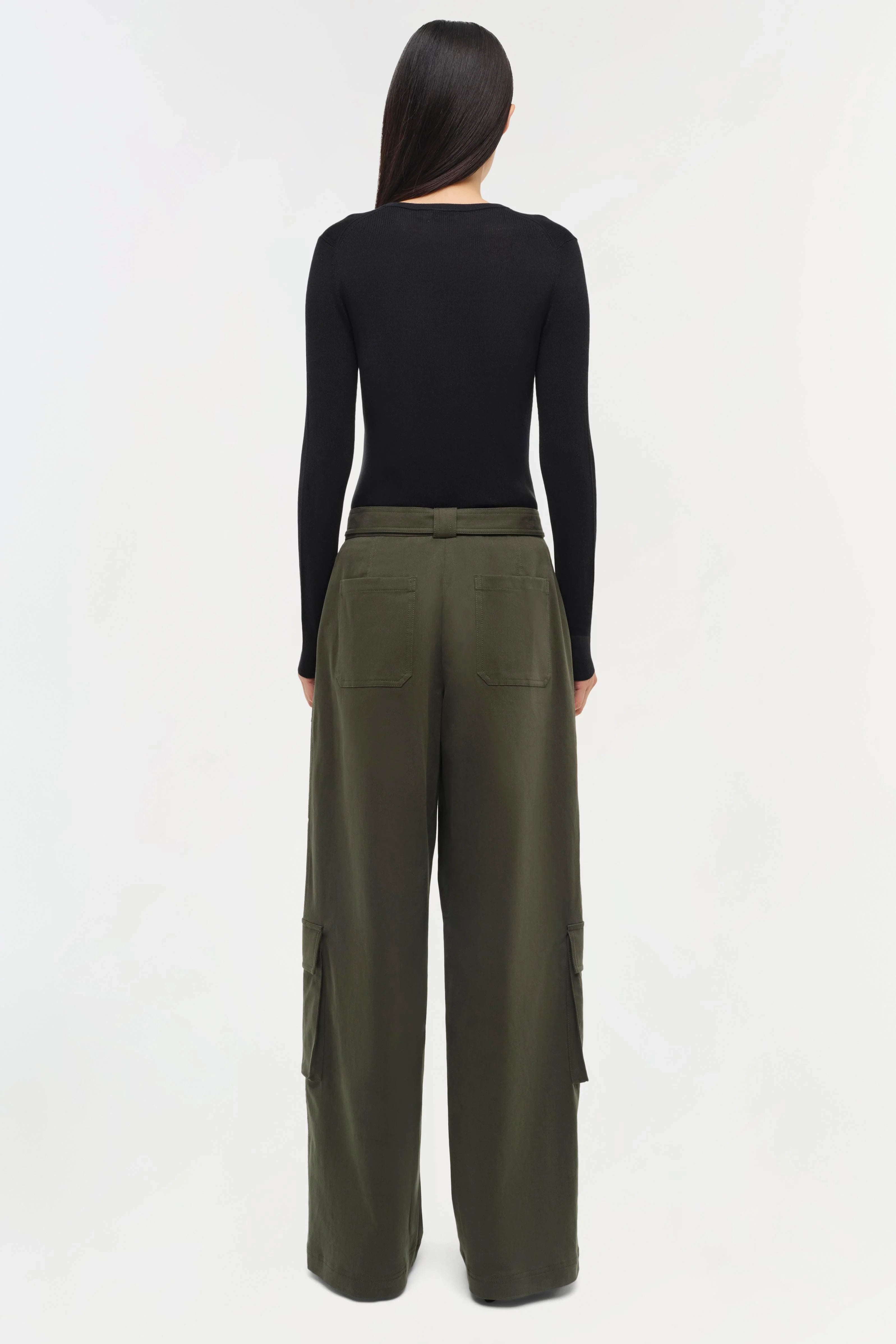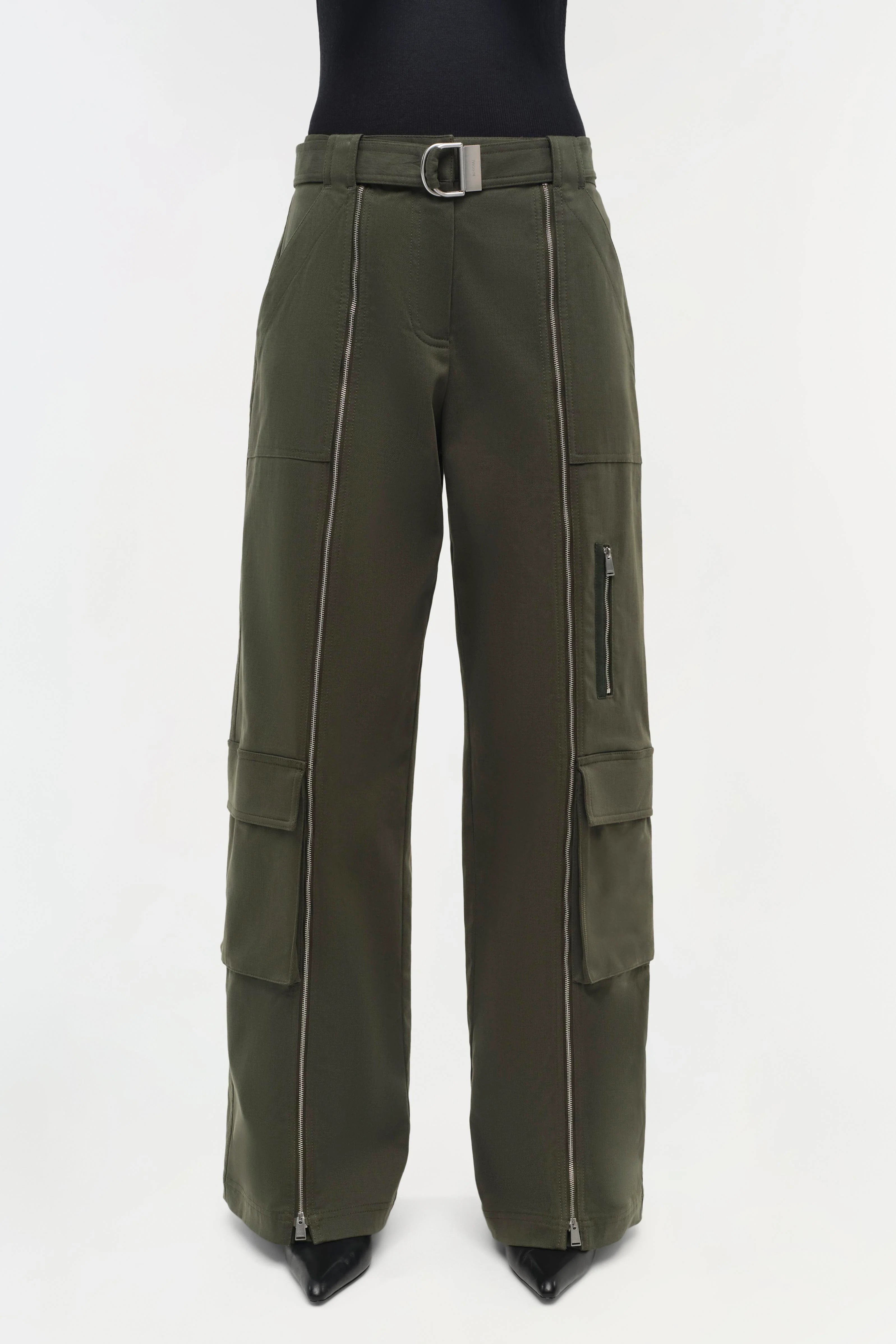 The Fabiana Pant in Moss. These belted bottoms feature a high waist and statement belt, creating a flattering silhouette. The utility-inspired design with multiple pockets adds a functional yet stylish touch.