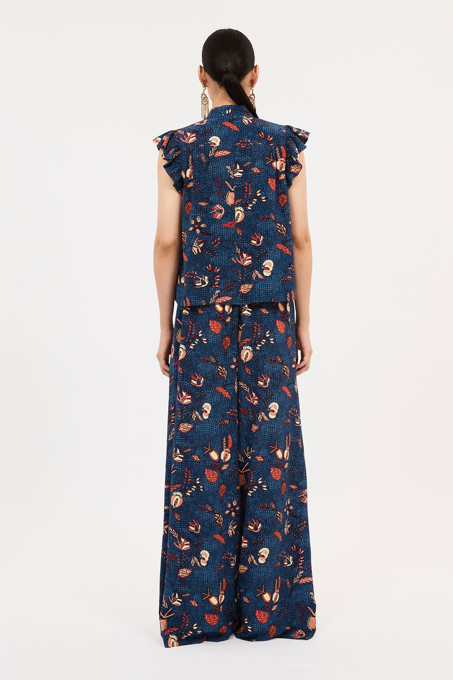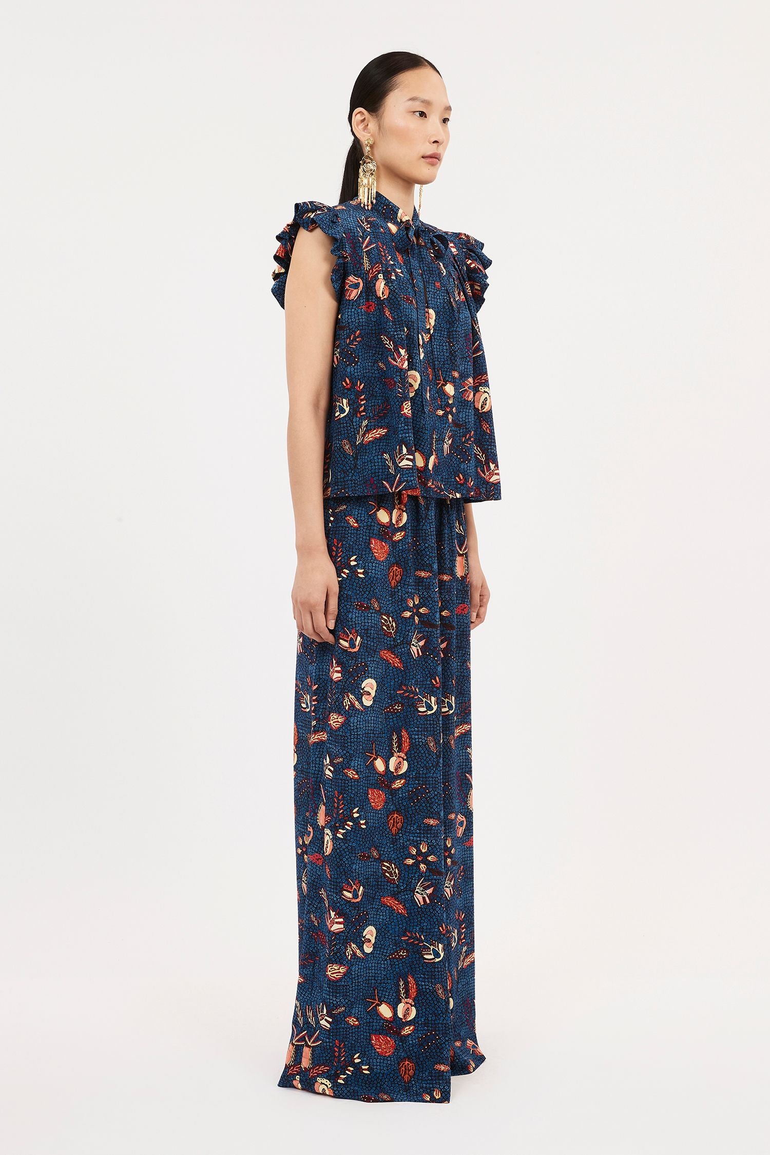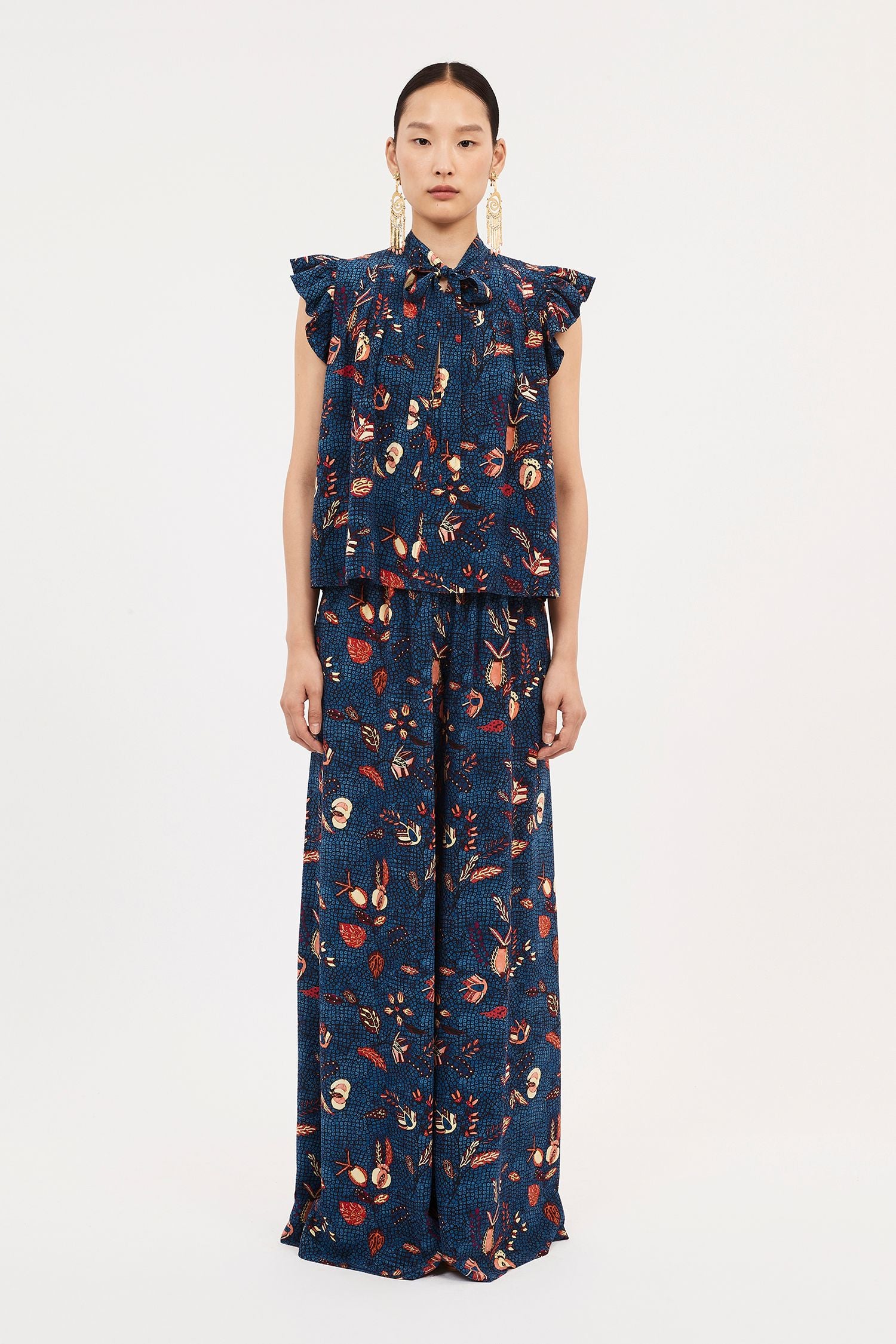 A forever favorite silhouette, our Callie Top features a blue dahlia motif. Crafted from luxurious silk crepe de chine, it features romantic flutters at the sleeves and neck ties you can fasten into an elegant bow.