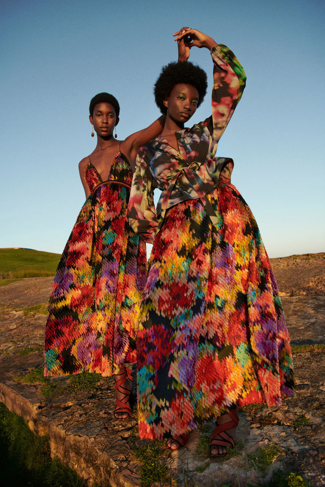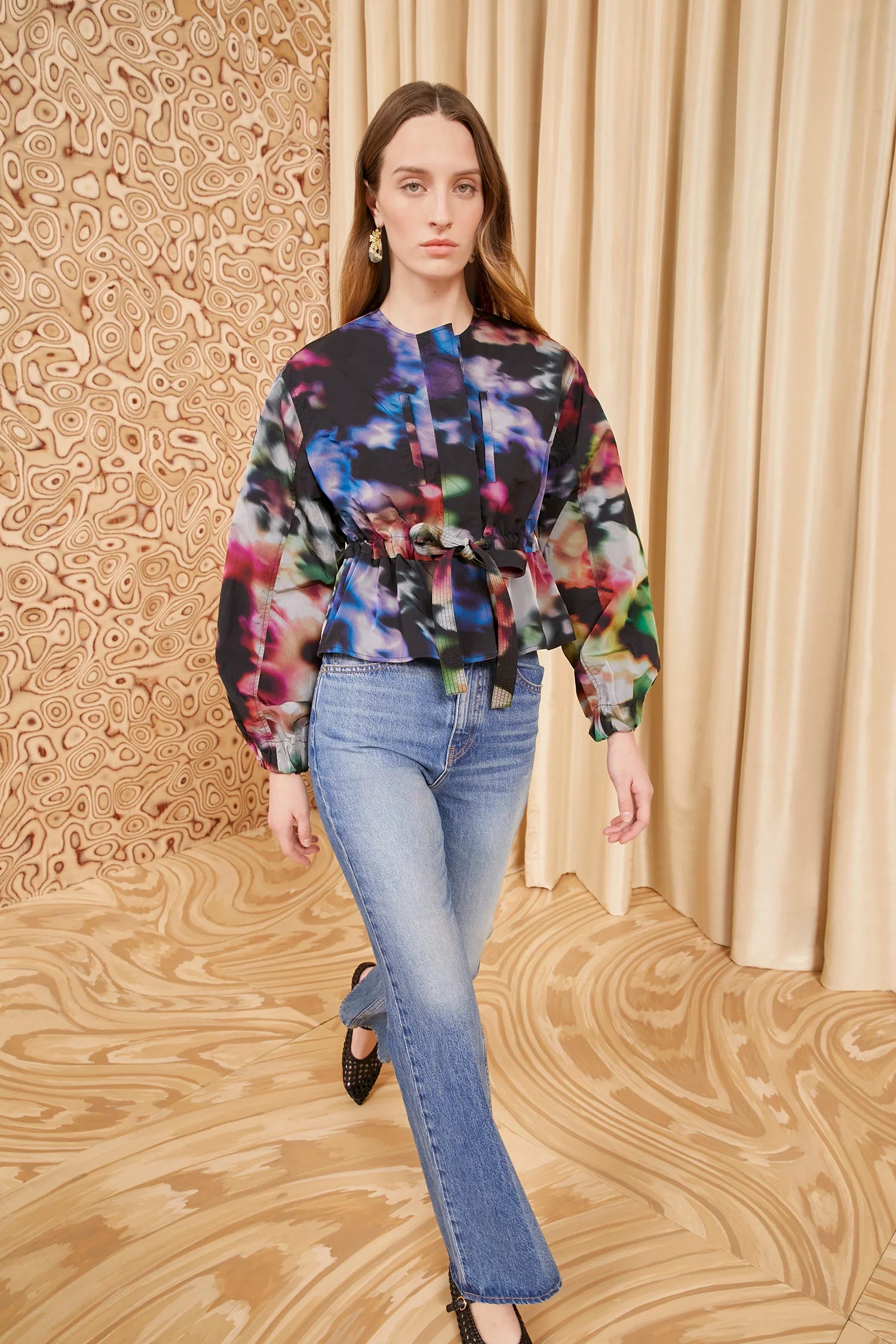 The Alair Jacket is a cropped, utilitarian style crafted from water-repellent Italian nylon adorned with abstract blurred florals in shades of pink, green, and blue. This lightweight jacket features a gathered elastic waistband with a tie that creates a lovely peplum detail. The voluminous long sleeves add an elegant touch, while the zipped pockets at the chest lend an air of pragmatism. It fastens with a concealed zipper and snap buttons at the front.
