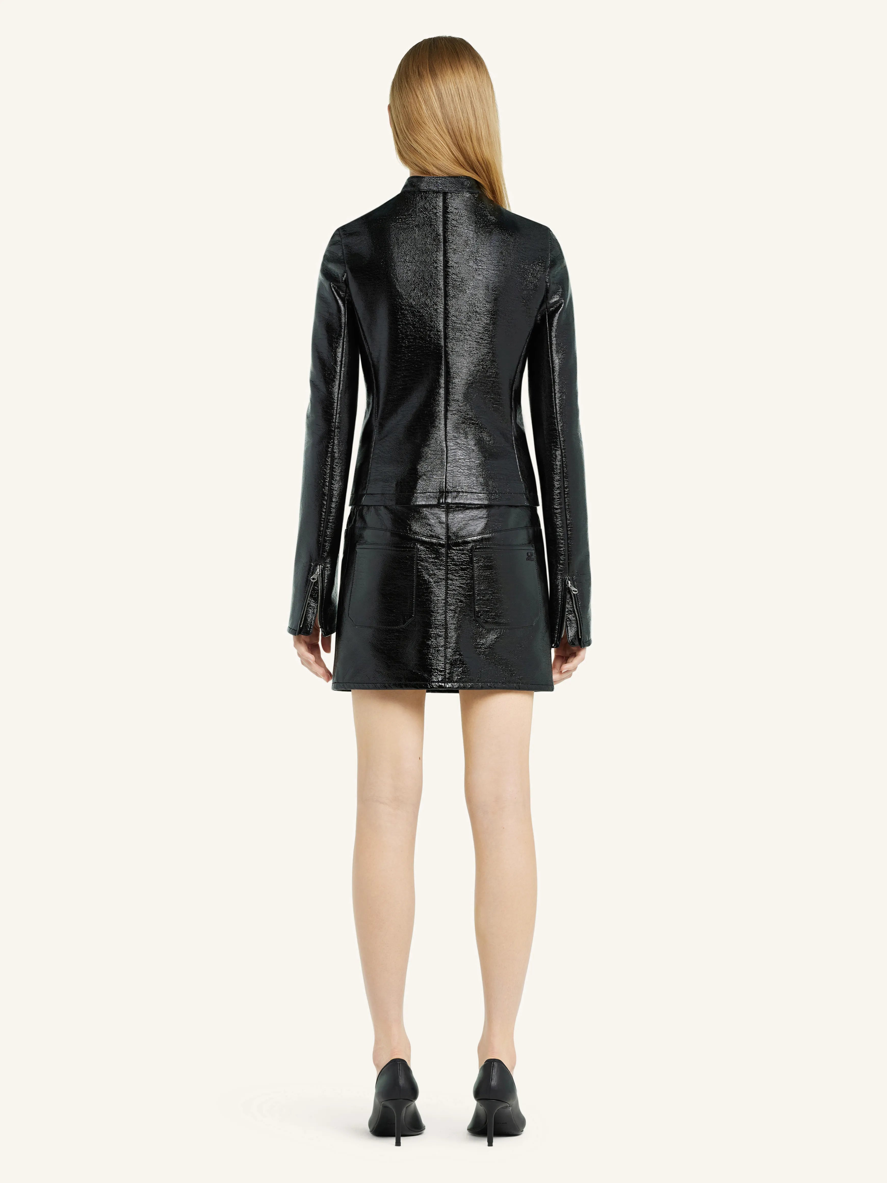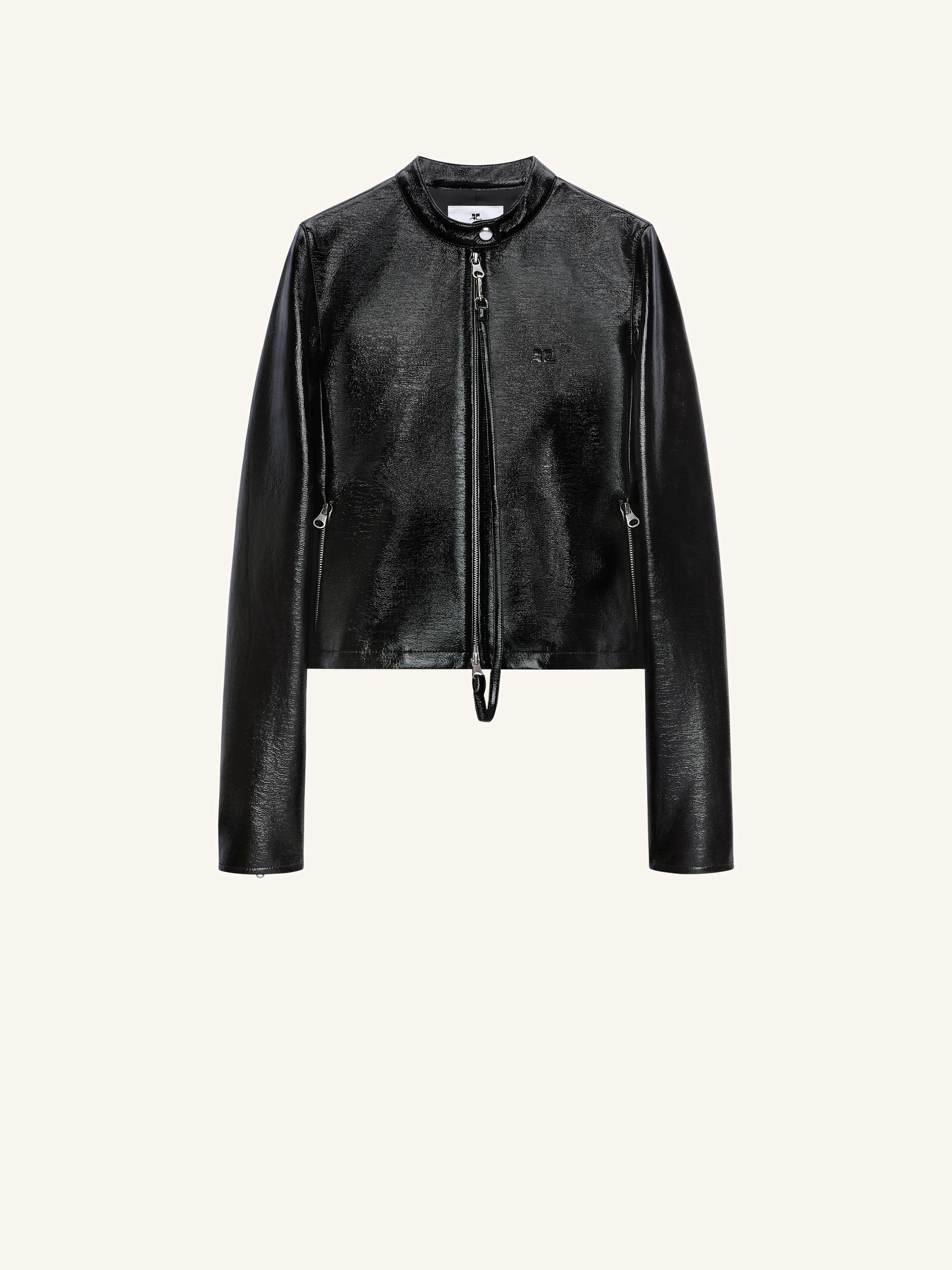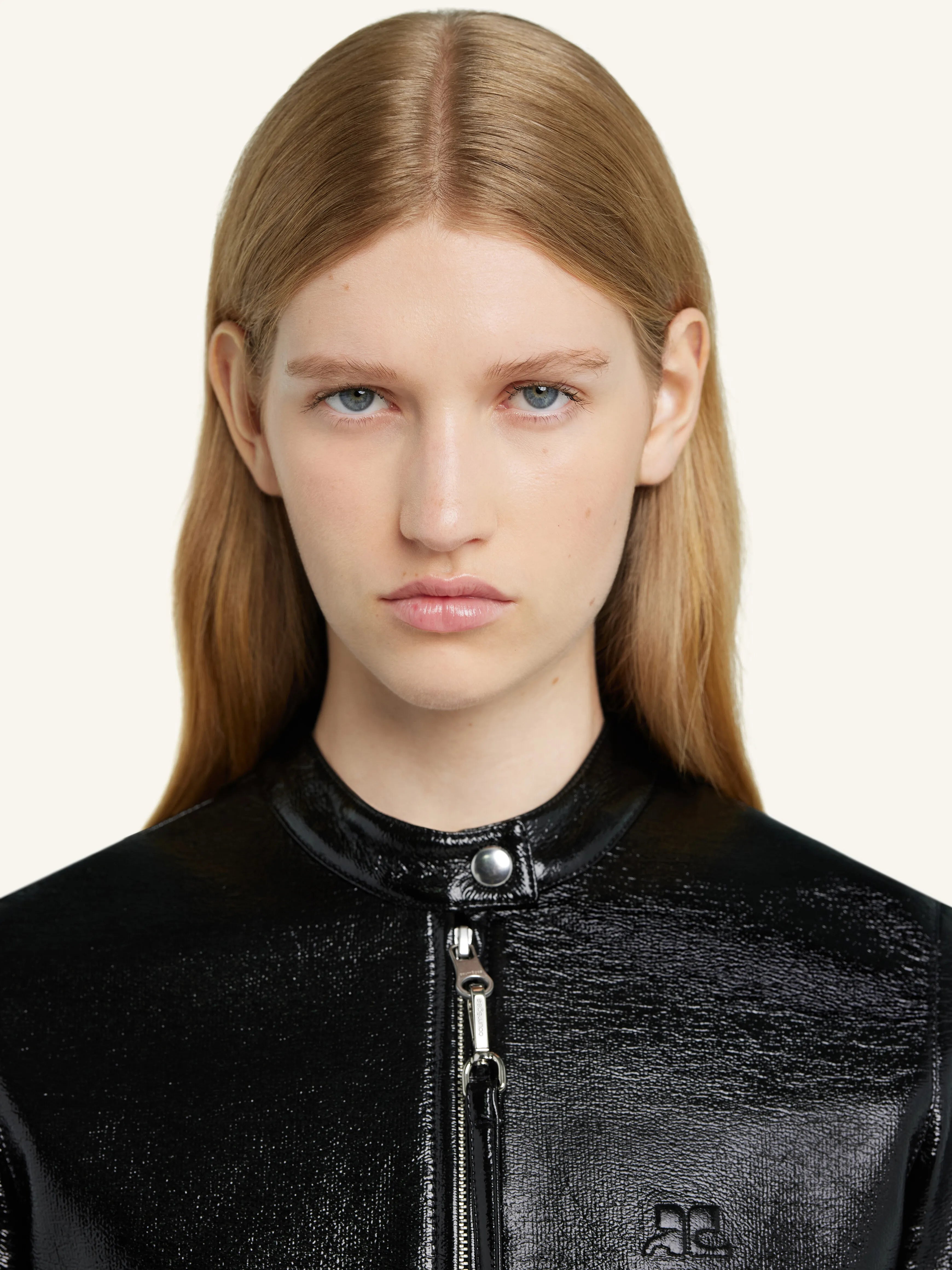 City style vinyl jacket with small shadow AC logo on the front. Vinyl detachable wire with double Courrèges snap hooks and adjustable fastening at collar. "Courrèges" logo on back tab.