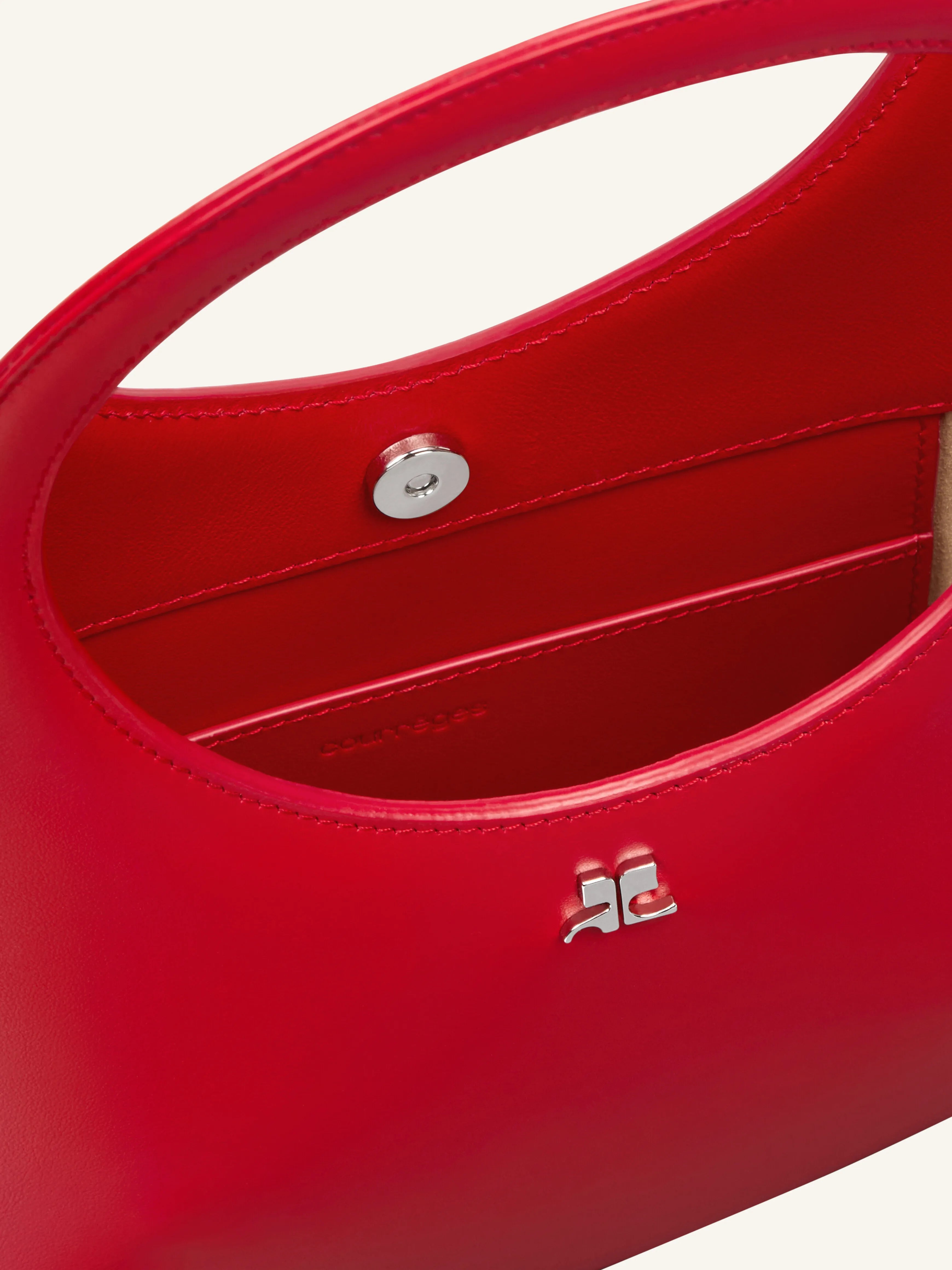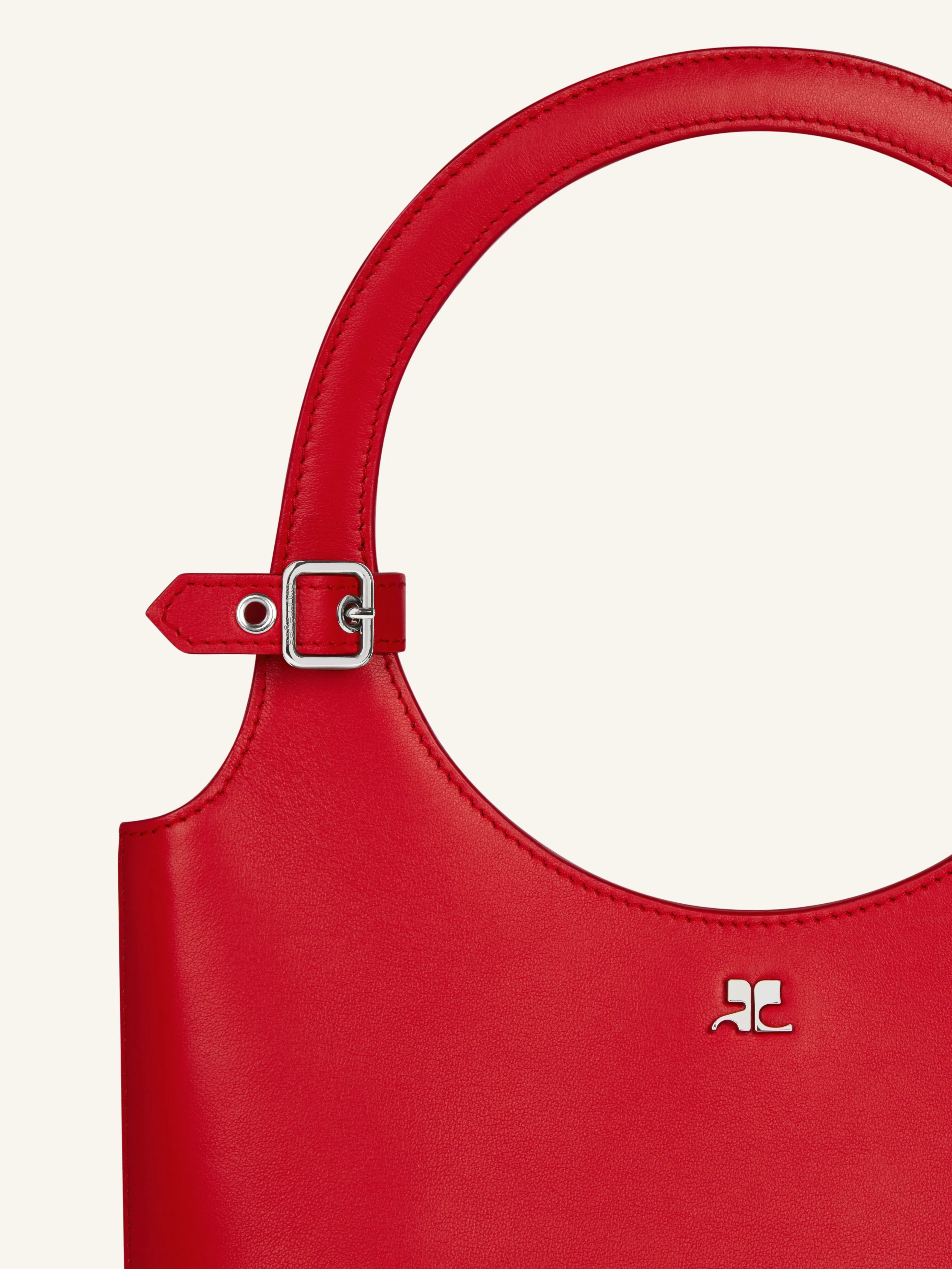 Smooth leather Holy bag with magnetic closure and metallic AC logo. Buckle detail on handles and interior pocket. Adjustable and removable shoulder strap. Embossed "Courrèges" logo on front.