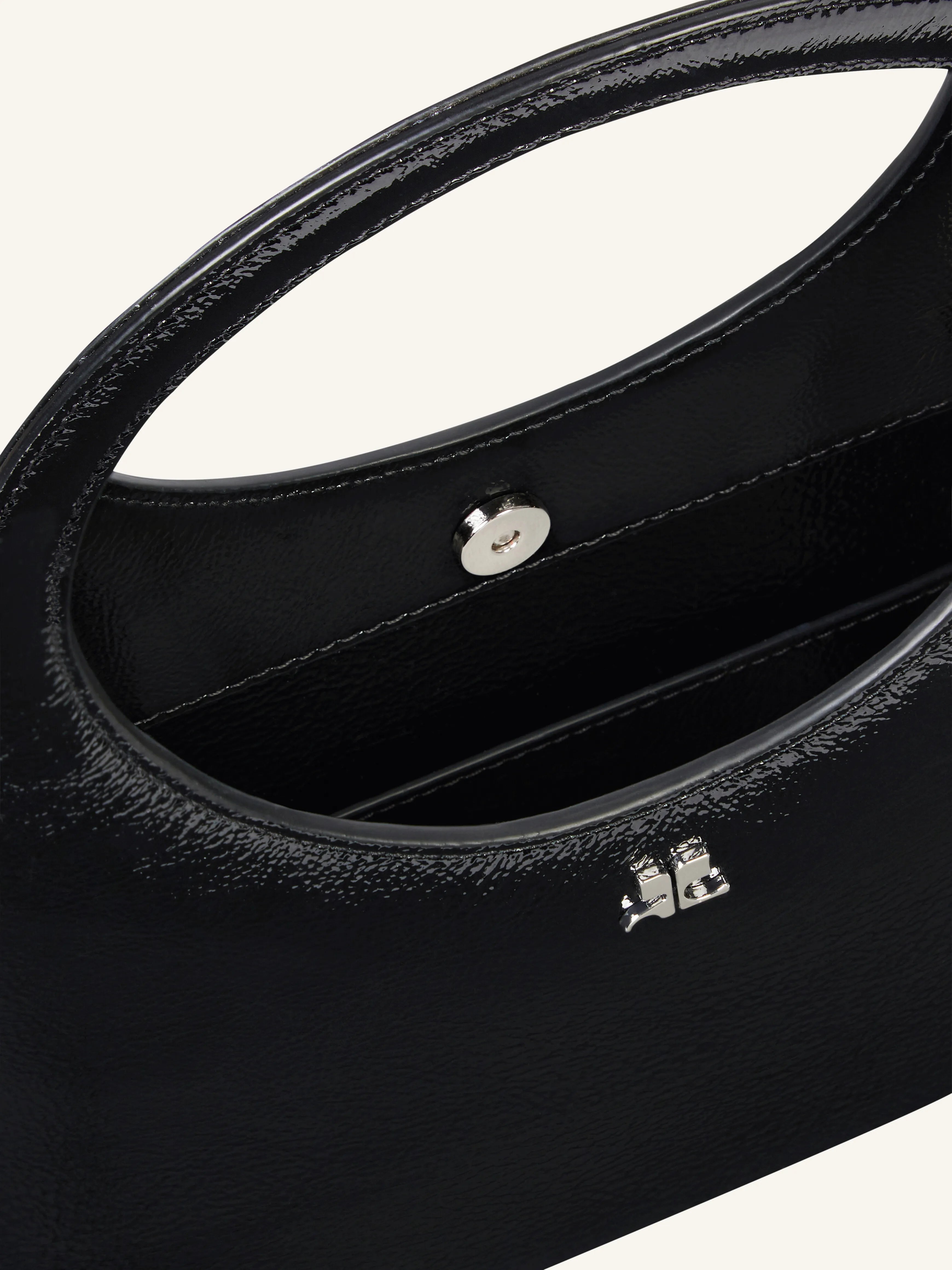 Holy bag in naplack calf leather with magnetic closure and metallic AC logo. Buckle detail on handles and inside pocket. Adjustable, removable shoulder strap. Embossed "Courrèges" logo on front.